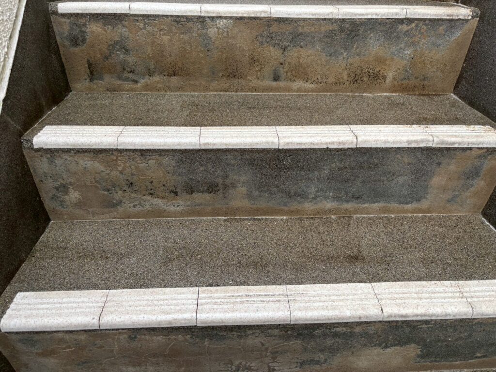 外部階段は、雨水や土埃に晒され、表面が黒く、また茶色く変色してしまっています。特に滑り止めの溝や、段差の立ち上がり部分に汚れが集中し、建物の印象を暗くしていました。
